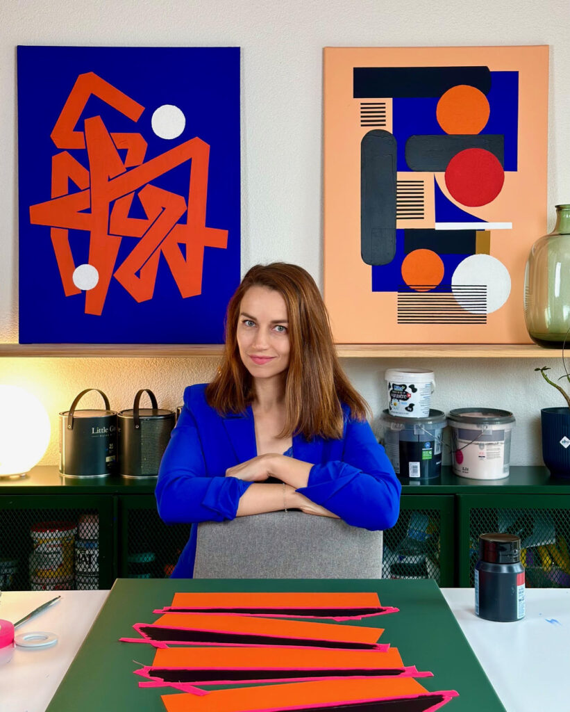 Médecin pathologue de formation, artiste par nécessité intérieure, Eilena Braye vit entre deux mondes qu’elle fait dialoguer chaque jour : celui du visible et celui de l’invisible. Dans son quotidien médical, elle scrute l’intime de la matière humaine, cellules, tissus, structures microscopiques. Ce regard aiguisé, précis, se transforme naturellement, une fois en atelier, en un langage visuel abstrait, géométrique, coloré.