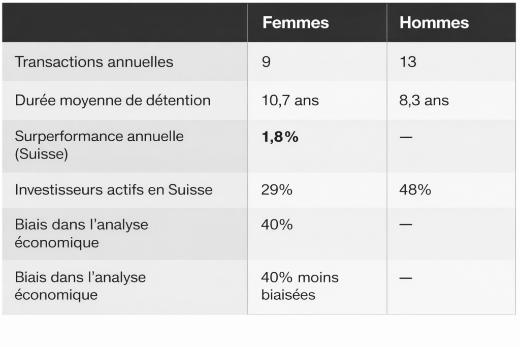 La Suisse célèbre ses administratrices… tout en ignorant ce que la recherche démontre depuis trente ans : les femmes sont de meilleures investisseuses que les hommes. Pas d’opinion, pas d’idéologie — des chiffres. Et c’est précisément là que réside le paradoxe le plus coûteux de la finance helvétique.