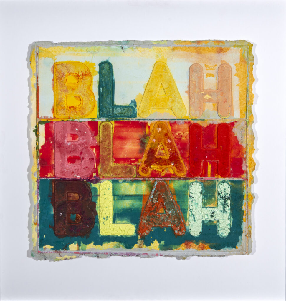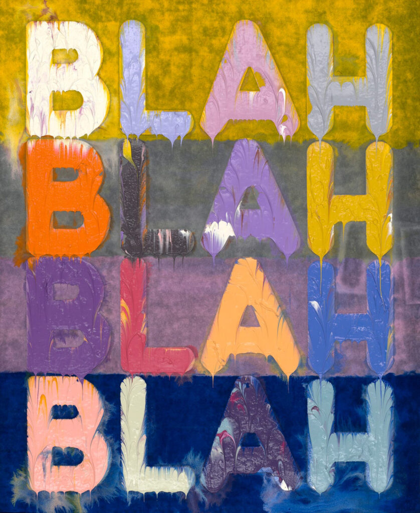 Ses premières pièces, souvent réduites à des mesures inscrites sur les murs, traduisent une volonté d’objectiver l’espace, de le ramener à une donnée. Mais très vite, ce rapport analytique se complexifie. Les mots apparaissent, puis envahissent la surface. Dans ses célèbres séries de synonymes, dans ses accumulations de termes, dans ses itérations du désormais iconique Blah Blah Blah, Bochner ne cherche pas à communiquer un message. Il met en crise la possibilité même de communiquer.