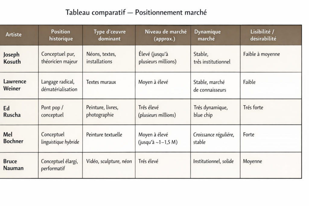 Ce positionnement le place dans une catégorie intermédiaire, entre les pionniers conceptuels historiques et les peintres contemporains à forte visibilité. Il bénéficie des deux mondes sans en subir les excès. D’un côté, il hérite du capital symbolique de l’art conceptuel. De l’autre, il offre au marché des objets tangibles, accrochables, désirables.