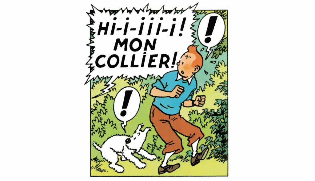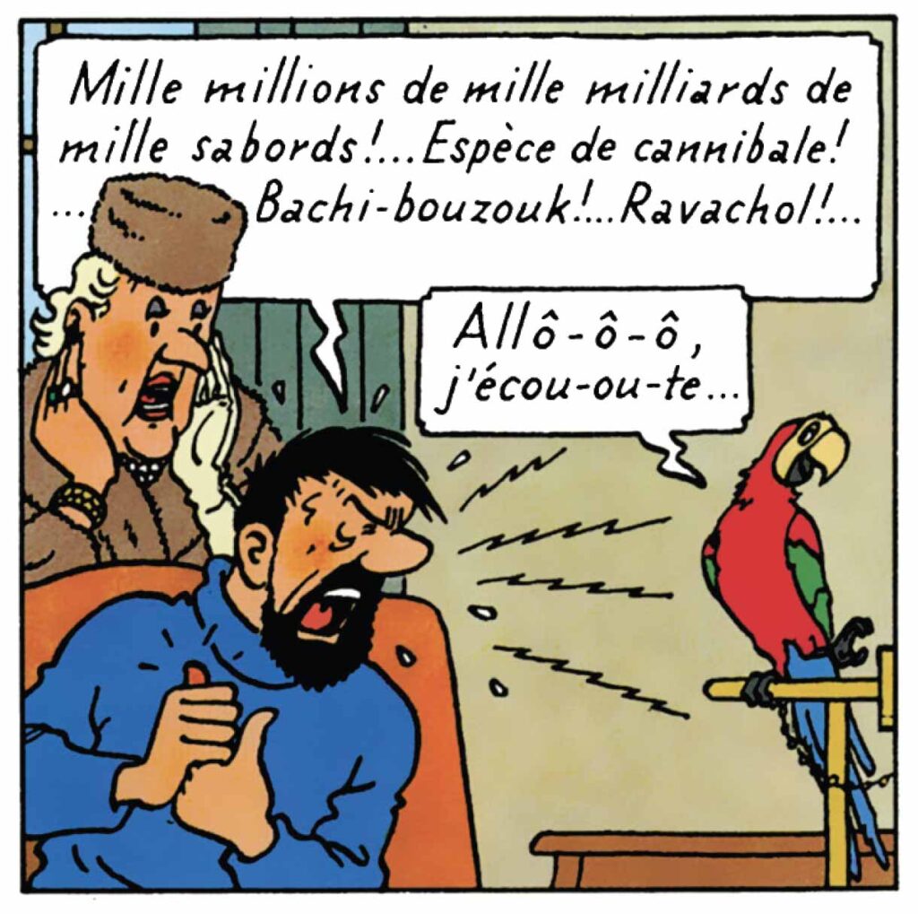 Comme souvent chez Hergé, l’action et la parole se brouillent, puisque la boucle est absurde : un perroquet bavard et omniscient, une diva qui parle trop et qui n’écoute rien, des glissades en répétition sur l’escalier abimé de Moulinsart par lequel tous circulent, et enfin, des appels en cascade qui finissent, immanquablement, à la boucherie Sanzot.