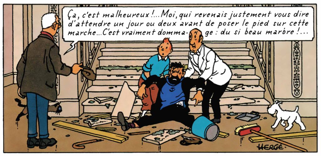 Quand tout va trop vite, l’information ne circule plus, elle se déforme, à l’instar de la marche cassée de l’escalier de Moulinsart, sur laquelle tout le monde passe et glisse, mais que personne n’arrive jamais à réparer, pas même le marbrier Boullu.