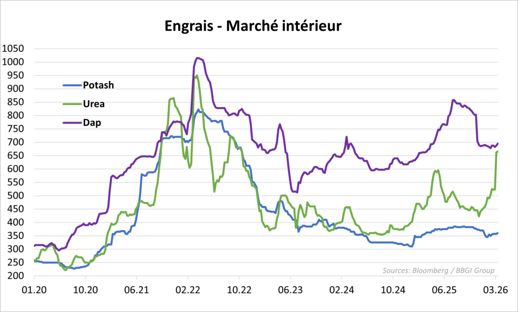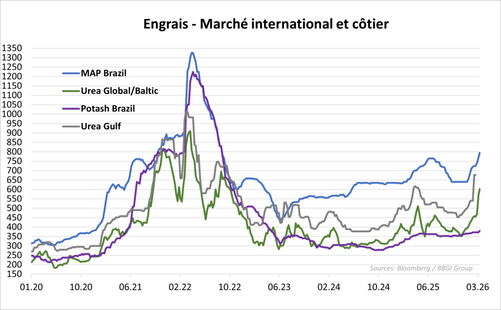 Les marchés boursiers commencent à intégrer cette différence. Alors que les entreprises pétrolières voient leurs cours fluctuer selon les prix du brut, les producteurs d’engrais sont valorisés selon leur « capacité de production en zone sécurisée ». Les sociétés nord-américaines (comme CF Industries ou Nutrien) voient leur valorisation croître, car elles sont les seules à pouvoir saturer le marché mondial devenu « affamé » par l’absence des volumes du Golfe. Pour les agriculteurs des pays importateurs (Afrique, Asie du Sud), le risque n’est pas seulement l’inflation, mais l’impossibilité d’acheter. Les taux de fret maritime, qui ont bondi de 50 % en mars 2026, combinés à la rareté physique, créent une barrière à l’entrée insurmontable pour les petits exploitants. Dans le contexte actuel, nous estimons que les cours des divers engrais devraient refléter durablement une perturbation importante sur les chaînes d’approvisionnement mondiales et affecter de manière distincte les pays producteurs de produits agricoles selon leur mix de production et leur capacité d’absorber une hausse des prix des engrais. Les cours de l’urée ont déjà bondi de 351 USD à 600 USD en quelques semaines en 2026.