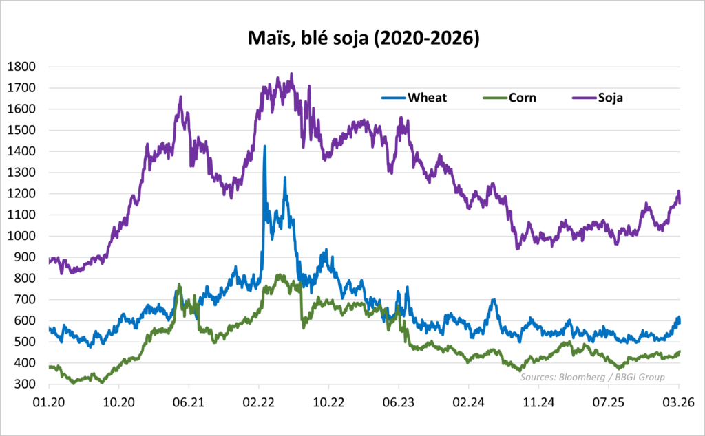 Le soja est le « grand gagnant » relatif de cette crise. Comme il s’agit d’une légumineuse capable de capter l’azote de l’air, il nécessite très peu d’engrais azotés. En période de crise, les agriculteurs délaissent souvent le maïs pour planter du soja, ce qui peut paradoxalement stabiliser son prix par rapport aux autres céréales.