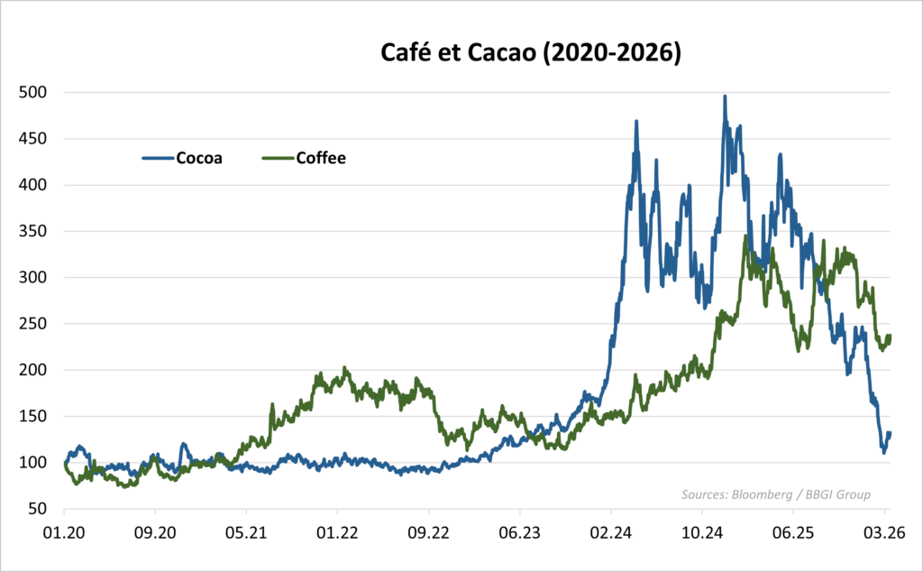 La situation du café et du cacao en ce mois de mars 2026 contraste fortement avec celle des fertilisants. Alors que ces derniers sont victimes d’un choc d’offre (impossibilité physique de transporter les engrais), le café et le cacao terminent une phase de déflation brutale après une période de spéculation intense. Le secteur du cacao vit un retournement spectaculaire. Après des sommets historiques en 2024 et 2025, les prix mondiaux se sont effondrés. Les prix élevés ont stimulé des investissements massifs dans de nouvelles zones de culture (Amérique latine) et encouragé une meilleure gestion des vergers en Afrique de l’Ouest. Le marché est désormais en situation de surproduction prévue pour la campagne 2026/27. Mais la baisse de près de 80 %des prix met en péril la survie économique des petits producteurs, créant une crise sociale profonde, alors même que les prix des produits finis (chocolat de luxe) restent élevés dans les pays consommateurs, illustrant une capture de valeur massive par l’industrie de transformation.