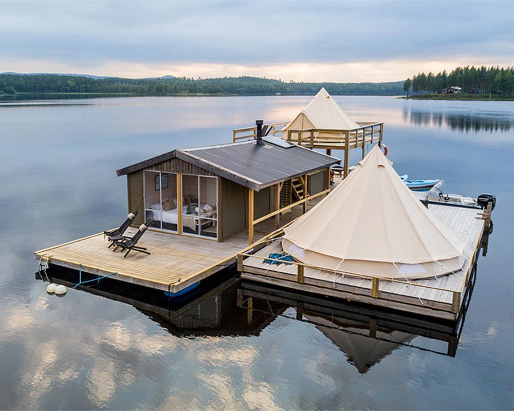 Le principe est simple : quelques structures légères installées sur un ponton flottant entièrement privatisé, accessible uniquement par bateau, au milieu d’un vaste lac. Aucun effet architectural, aucun dispositif ostentatoire. L’ensemble repose sur une logique d’usage très claire : limiter les interactions avec l’extérieur pour maximiser la qualité de présence sur place.
